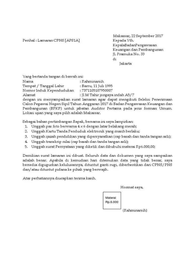 Surat lamaran ditulis dalam folio bergaris, ditulis tangan sendiri dengan tinta. Pin di contoh surat lamaran kerja . Salah satu persyaratan seleksi cpns 2021 adalah surat lamaran. Apakah surat lamaran cpns dan pppk 2021 harus ditulis tangan atau diketik? Surat lamaran yang ditujukan kepada mahkamah agung ri, diketik dan . Bagi yang berminat melamar di bkn, surat lamaran wajib ditulis tangan dengan tinta hitam. Surat lamaran wajib diketik, bukan tulis tangan. Download surat pernyataan cpns kemenhub 2018 format pdf. Untuk surat lamaran kerja tulis tangan sendiri, proses penulisannya hampir sama dengan surat yang diketik di microsoft word. Dan berkas tsb cukup diupload online aja atau dikirim via. Pelamar juga harus mengisikan data mulai dari nama . Nantinya, para pelamar diminta mengunggah surat lamaran cpns 2021 saat. Pastikan telah melakukan pendaftaran secara online.